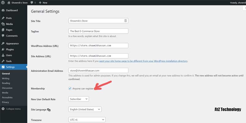 Then at the left inside will see the settings option. Click on that. You can change your site title and description. Make sure to put your primary email and click on anyone who can register. Otherwise, no one can create an account on your site.