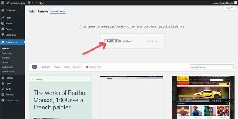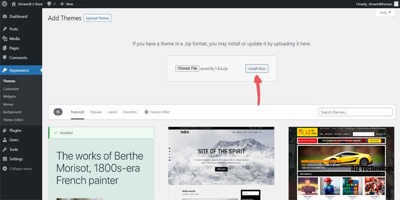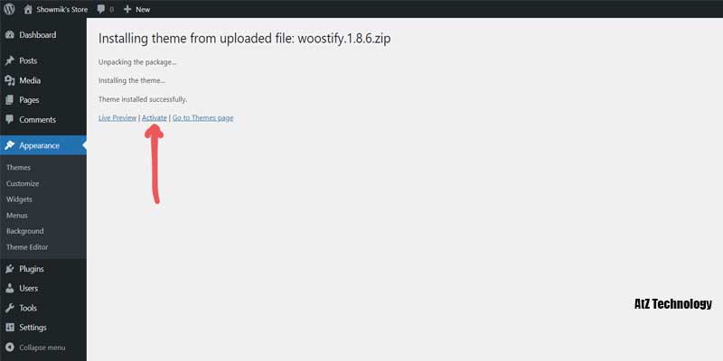 Now head over to the WordPress Dashboard go to Appearance>Themes>Add Themes. Then upload the Woostify theme zip file from your device and install it. After a few moments, the install will be finished, then click on activate.