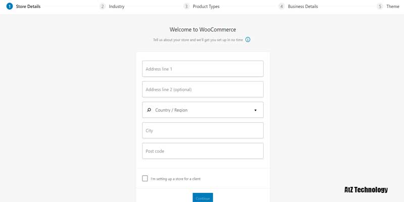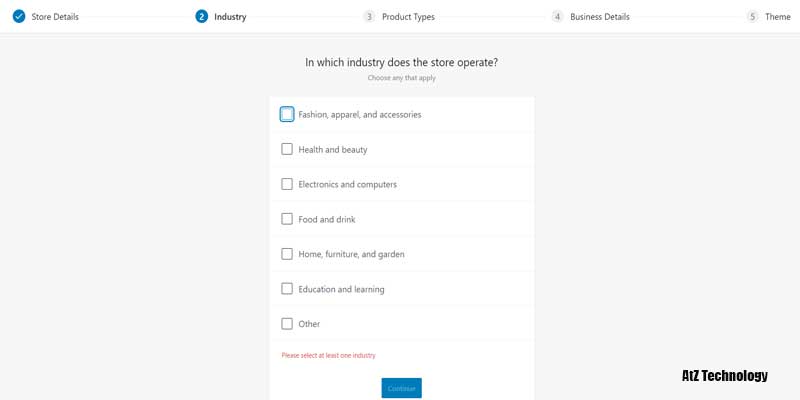 The first one is Store Details. Fill in all of your store information, and then click on continue. Second, select your product type from the industry tab.