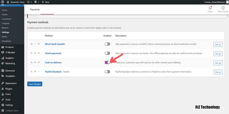 Now, go to the Payments tab, and from there, you can manage different payment options. From there, toggle cash on delivery and click on setup. Edit your details if you want. Then come back to the section again, and from there, you can add bank transfer or PayPal if you wish. And that’s all for the settings of WooCommerce.