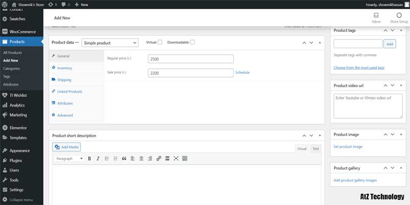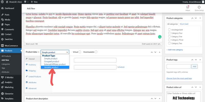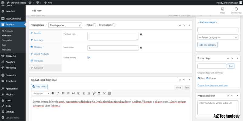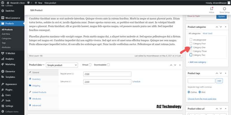 Now, go to the short description and add the product short description. There are some other options on the right side of the page. You can add different categories, add product tags, product video URLs and product images. I’ll add some dummy categories like Category One to Category Four.
