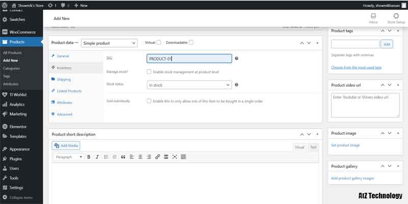 The next one is the inventory tab. From the inventory section, you can add SKU (Stock Keeping Unit). I’ll keep it simple by giving the name PRODUCT-1. But you need to be aware that all of your product SKUs must be unique. Besides, you can manage your stocks from there.