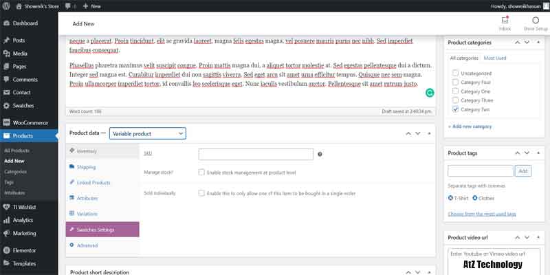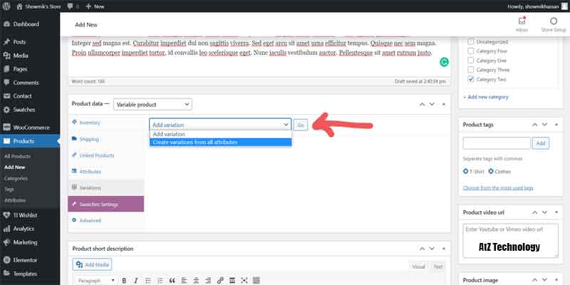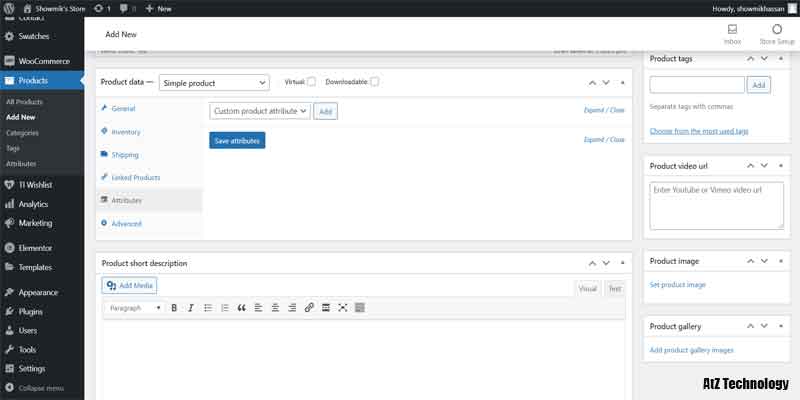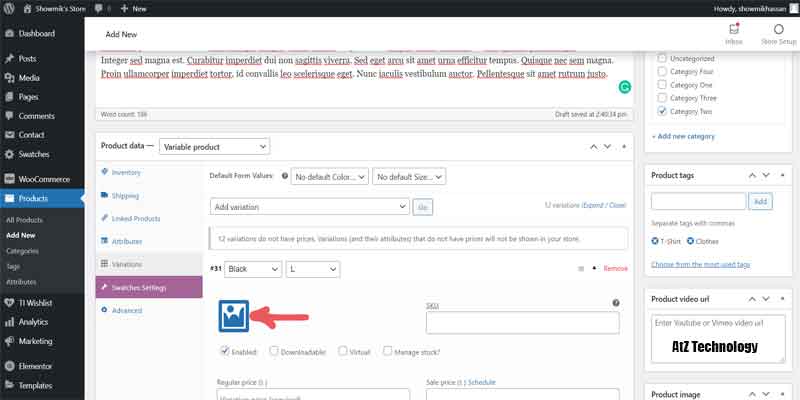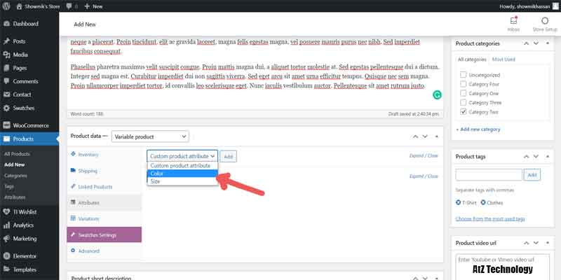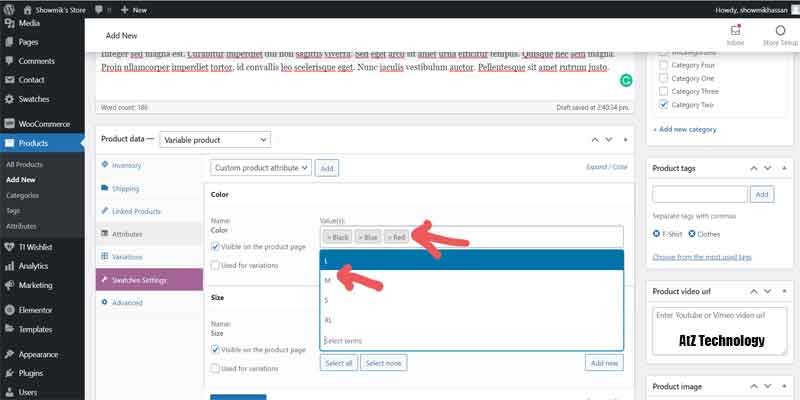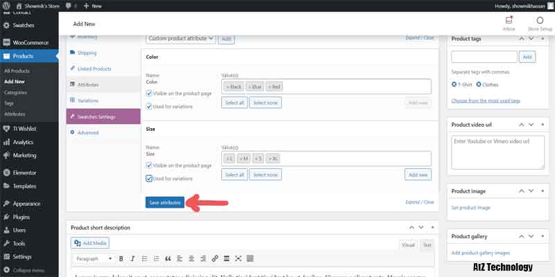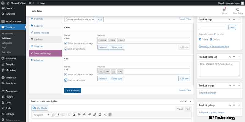 Everything will be the same, like simple products, but in Product, Data select Variable Product. Now, from the Attribute tab, add color and size. Click on the values section and add all the color and size names. On both of them, tick on Used for Variation. And now click on the save attribute.