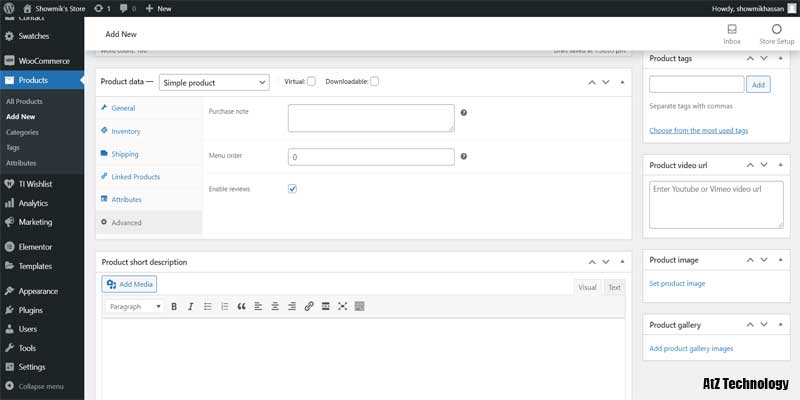 So, I’ll keep this blank. And from the attribute tab, you can add attributes of the products like color, sizes, amount, etc. But for a simple product, you don’t need to create or select any attribute. It is used only for variable products. And from the advanced tab, you can add a purchase note and manage your review.