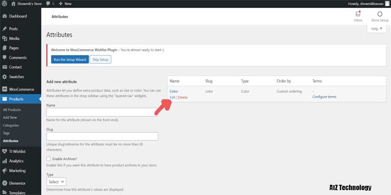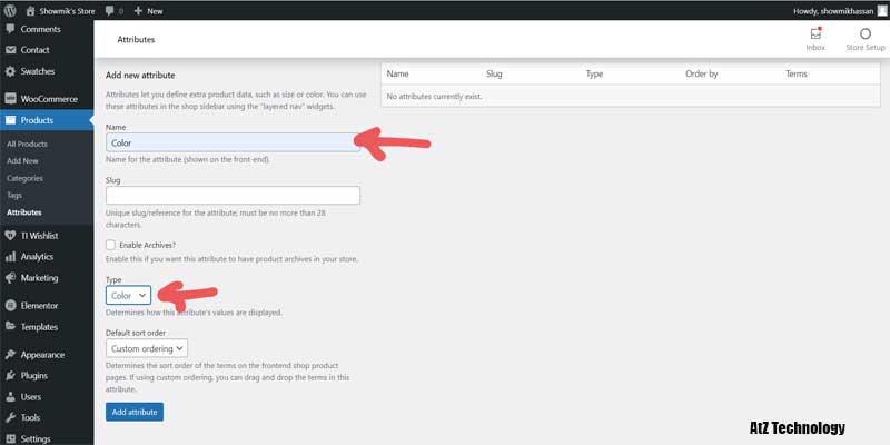 But you need to go to the Attribute section under the Product tab. From there, you can add attributes of your products. Give a name of your attributes. I’ll make it a Color. Now select the type of it. On the dropdown, you will find color. Now click on the add attribute.