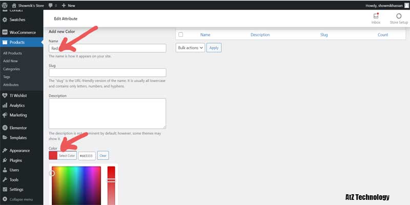 On the right-hand side, you will find the section of the Color attribute. Now click on configure terms. Give the name of the color you want to add and select the color from the color picker. Now click on add new. Your color will be added. You can add as many colors as you want.