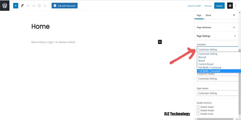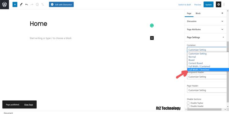 Now from the right side, you’ll find a container option. Select Full Width/Stretched. Then from the top, click on update. Again do to the dashboard and under-setting go-to reading. Now from your home page display, select A static page. Then from the dropdown, select Home. If you go to your sites from the dashboard, you will find the homepage you created earlier instead of the default post page.