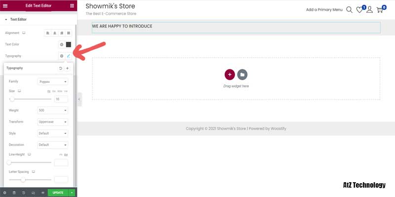 First, let’s add some text to that section. Drag a text editor element on that, and I’ll do some styling. First, change the text color. I’ll choose a darker color. Change its typography. Make the font family Poppins, text-size 16, transform uppercase, and weight 500.