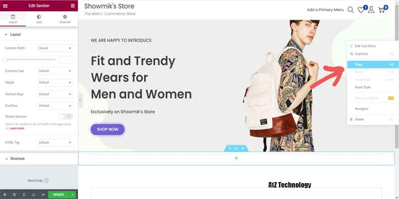 You can design your homepage like this. Now let’s add a new section. You can copy your previously made element by right clicking on that. I’ll copy the first element from the banner and paste it to the recently made section. Then you can re-edit and redesign the area. Change the content, make it centre align, and change the typography also.