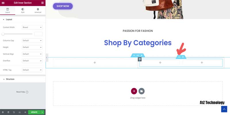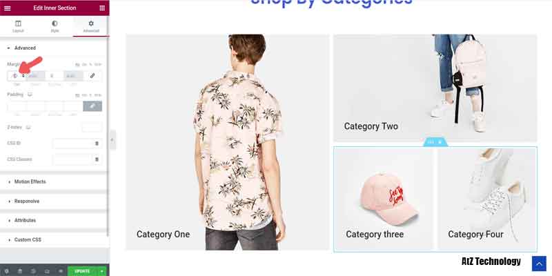Now click on the black edit column icon and go to advanced settings. Inside CSS Classes type woostify-shop-category. Type it on both columns, and the category look will change.