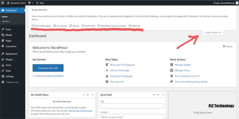 Now. First of all, this is your dashboard, and under your dashboard, you’ll see several widgets available. These widgets are not helpful so that you can do one thing again, just untick all these things from here. So click on-screen options. And an untick.