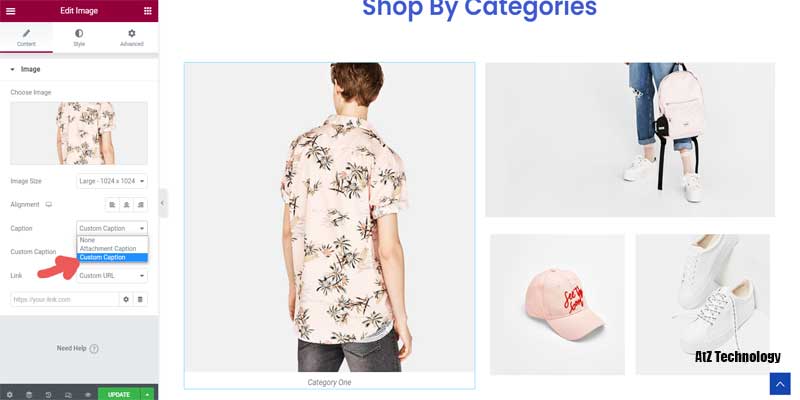 You can add custom captions from the edit image element. Also, you can use a custom link so that whenever someone clicks on the image, it will go to the desired link. You will find the category links URL on the product category section from the dashboard.