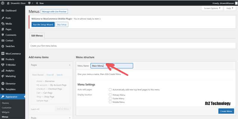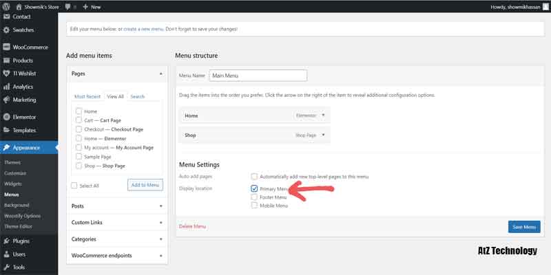 We don’t have a menu yet, so let’s create a new menu and do that thing over appearance and click on menus. Now, first of all, let’s give it a name. So first, I want to create my main menu. So give it a title of the Main Menu. They can create meaning, and after that, we have to select all the different pages you want to display. Like home, shop, and other pages if you wish to or create. Also, make sure to check the tick mark underneath the menu section called Primary Menu.